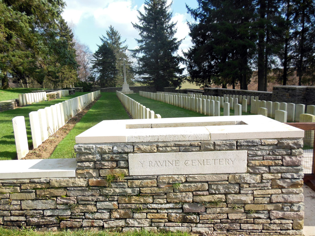Le ravin en « Y » s’étend d’est en ouest, à environ 800 mètres au sud du village, soit de la « route de la station » jusqu’à la ligne de front de 1916; il s’agissait d’un profond ravin aux parois escarpées, parsemé d’abris, l’extrémité ouest se scindant en deux courts bras tendus vers l’extérieur. Les unités de la 29e Division (qui comprenait le Royal Newfoundland Regiment) ont atteint le village de Beaumont-Hamel le 1er juillet 1916 et l’ont attaqué, mais elles ne sont pas parvenues à le tenir. Le 13 novembre 1916 le village a été attaqué de nouveau et capturé, y compris le ravin, par la 51st Highland (Scottish) Division. Le parc commémoratif de Terre-Neuve, ainsi que les monuments commémoratifs de la 29e Division et de la 51e Division qui s’y trouvent, commémorent ces engagements. Le cimetière du ravin en Y se trouve à l’intérieur du parc. Le village a plus tard été « adopté » par la ville de Winchester, tout comme trois autres villages de la Somme. Le cimetière a été aménagé par le V Corps au printemps de 1917, à la suite du nettoyage des champs de bataille. À l’origine, le cimetière fut appelé le « Y » Ravine Cemetery No 1; après l’Armistice, le cimetière no 2 a été concentré au cimetière britannique de l’Ancre, à Beaumont-Hamel. Plus de 400 victimes de la guerre de 1914-1918 sont aujourd’hui commémorées dans ce lieu. De ce nombre, plus du tiers sont des soldats inconnus, et des monuments spéciaux ont été érigés en souvenir de 53 soldats (ou marins) du Royaume-Uni et de huit soldats de Terre-Neuve qui sont enterrés ou que l’on croit être enterrés parmi eux. Le cimetière, qui s’étend sur une surface de 1 166 mètres carrés, est entouré par des murs de moellons.