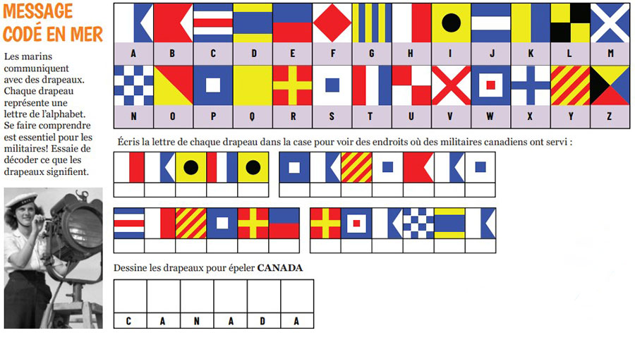 Les marins communiquent avec des drapeaux. Chaque drapeau représente une lettre de l’alphabet. Se faire comprendre est essentiel pour les militaires! Essaie de décoder ce que les drapeaux signifient.