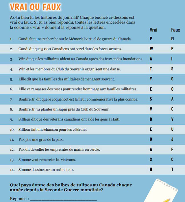 As-tu bien lu les histoires du journal? Chaque énoncé ci-dessous est vrai ou faux. Si tu as bien répondu, toutes les lettres encerclées dans la colonne « vrai » donnent la réponse à la question.