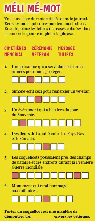 Voici une liste de mots utilisés dans le journal. Écris les mots qui correspondent aux indices. Ensuite, place les lettres des cases colorées dans le bon ordre pour compléter la phrase.