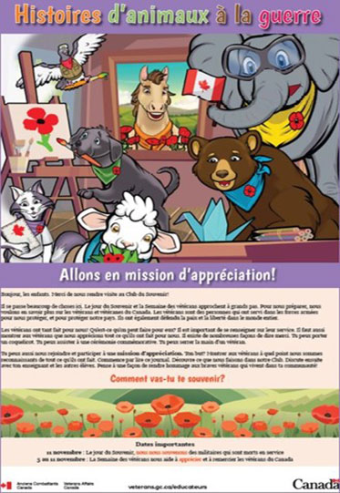 Chaque année depuis 2006, six personnages, soit des animaux membres du Club du Souvenir, sont mis en vedette dans une nouvelle édition du journal Histoires d’animaux à la guerre, qui sert à initier les jeunes lecteurs au concept du Souvenir de manière non menaçante. Un nouveau personnage animal s’est joint au Club en 2024 : Pax le mouton.