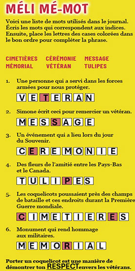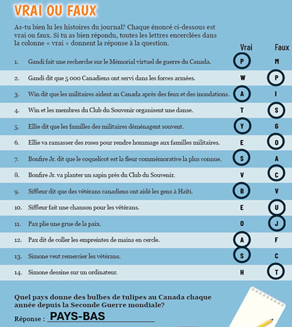 Activités d’apprentissage Introduction Affiche Groupes d’experts Glossaire Réponses aux activités du journal Chasse au trésor Compte le souvenir Message codé en mer Méli mé-mot Vrai ou faux