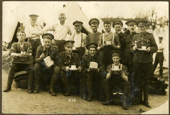 Soldats du Newfoundland Regiment qui préparent un repas dans un camp d’entraînement en Écosse, 1915.