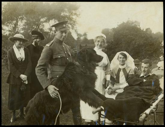 Dans son rôle de mascotte, Sable Chief visitait aussi les soldats blessés. Le voici avec le maître-chien Hazen Fraser, un soldat blessé, et des infirmières militaires à Londres, en 1917. À plus de 150 livres (68 kilos), sa grande taille attirait beaucoup l’attention! Cet ami poilu avait le don de remonter le moral du régiment.