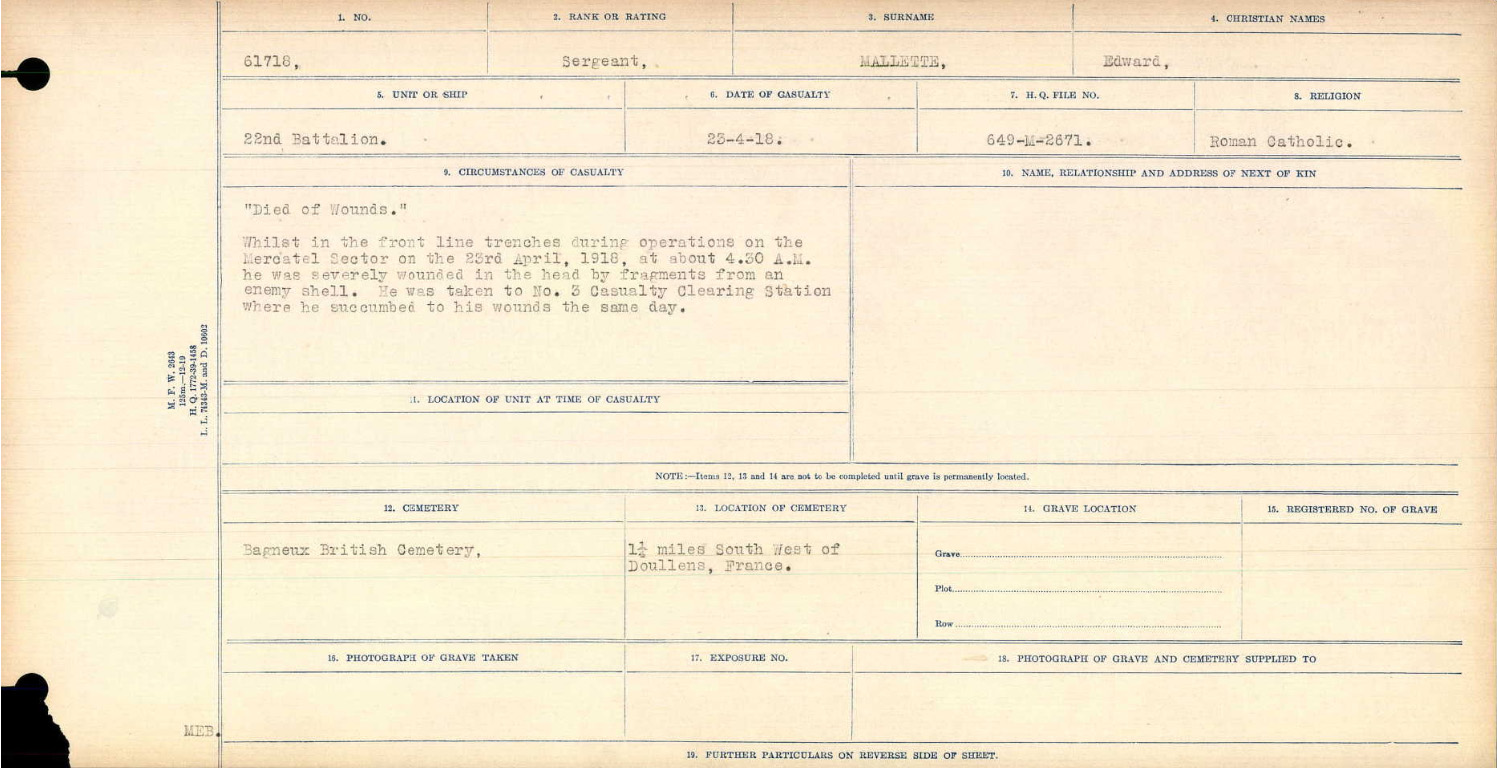 Blessé d’un éclat d’obus à la tête, dans les tranchées de première ligne à Mercatel, il a été évacué jusqu’au Poste de triage des blessés n° 3 à Gézaincourt et il y est mort le jour même.