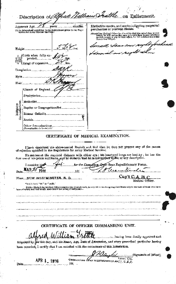 Fils de M. et Mme A. Trattle, de London, Angleterre; époux de Emma Elizabeth Trattle et père de Alfred et William John Trattle de Fort Langley, Colombie-Britannique.