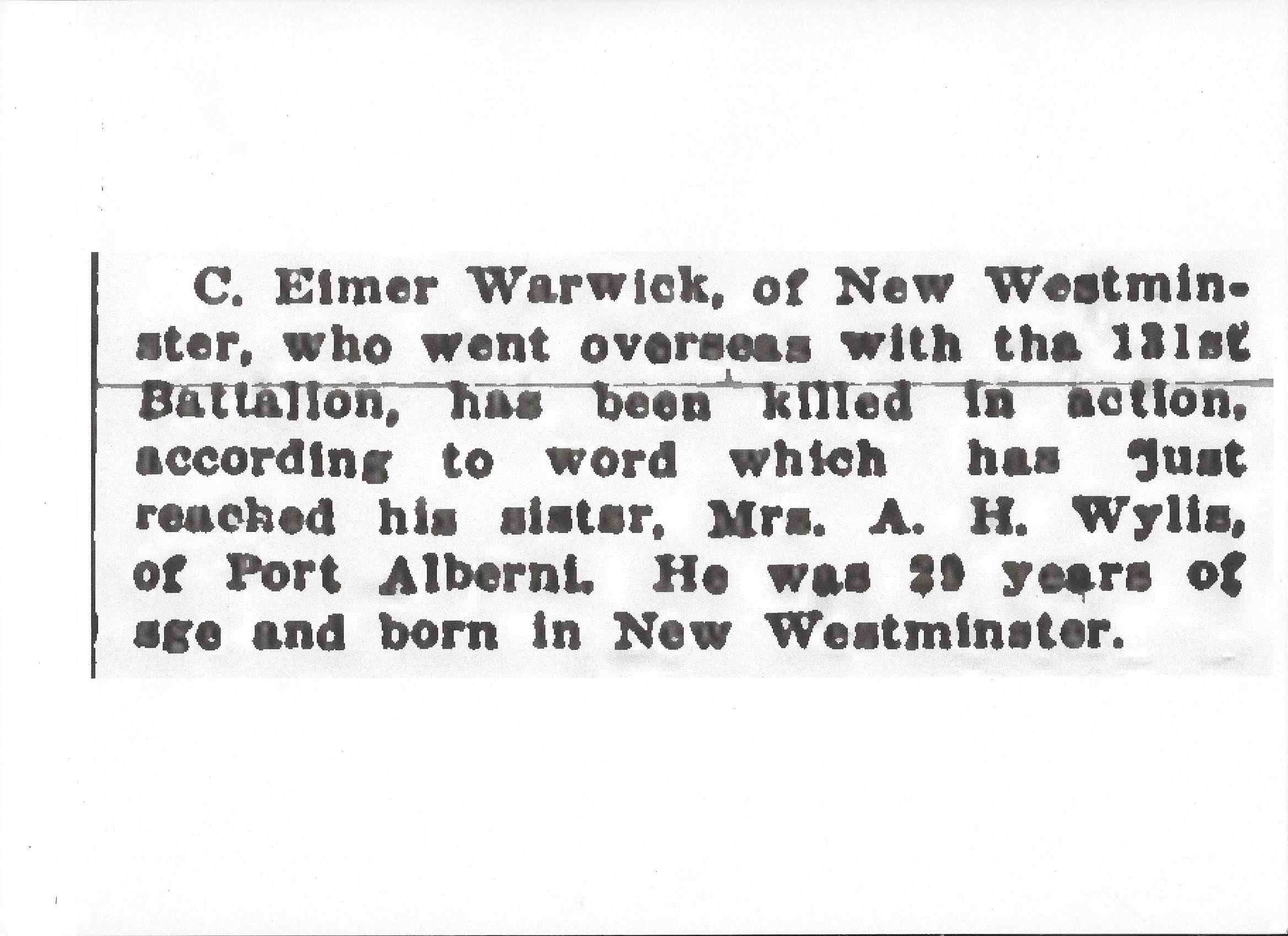 Fils de Charles et Mary Anne Warwick, de 609, Agnes St., New Westminster, Colombie-Britannique.
