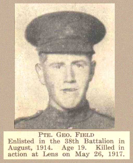 Frère du soldat Alfred James Field, décédé le 22 avril 1915 pendant qu’il servait dans le Canadian Infantry (Eastern Ontario Regiment).