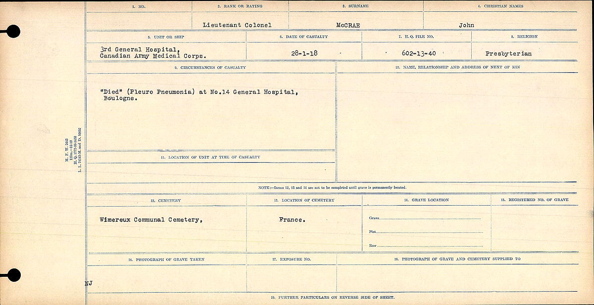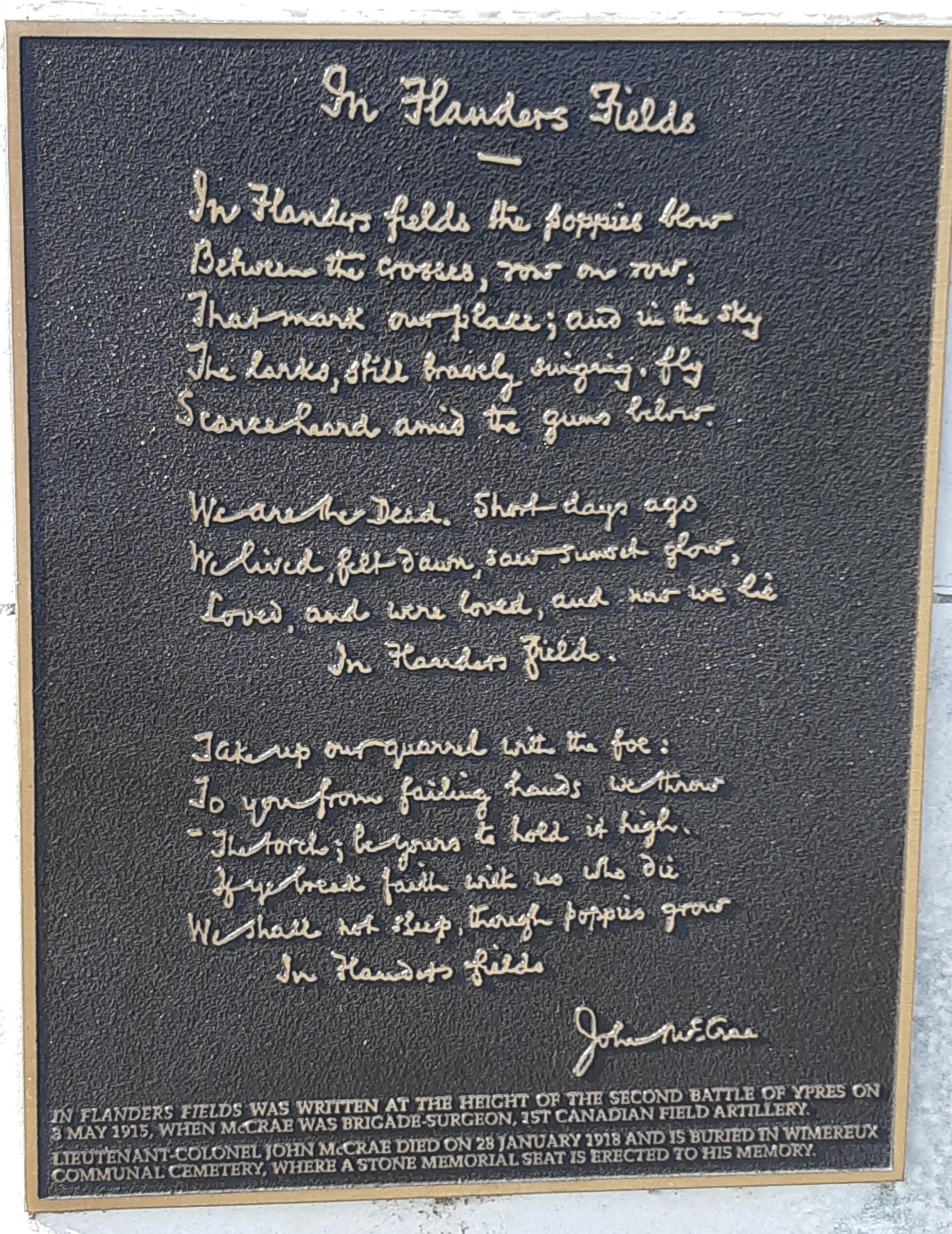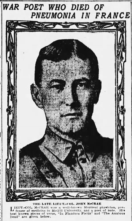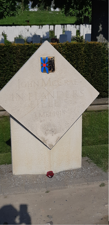 La veille de la composition de son illustre poème, il perdit au cours des combats un de ses meilleurs amis qui fut inhumé dans une tombe de fortune marquée d'une simple croix de bois. Les coquelicots sauvages commençaient déjà à fleurir à travers les croix de bois placées sur les tombes. Incapable de porter secours à cet ami ni à aucun autre soldat tombé au champ, John McCrae se fit leur porte-parole dans son poème. Ce fut l'avant-dernier poème qu'il écrivit.