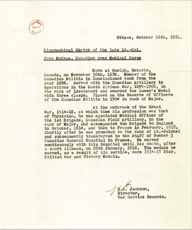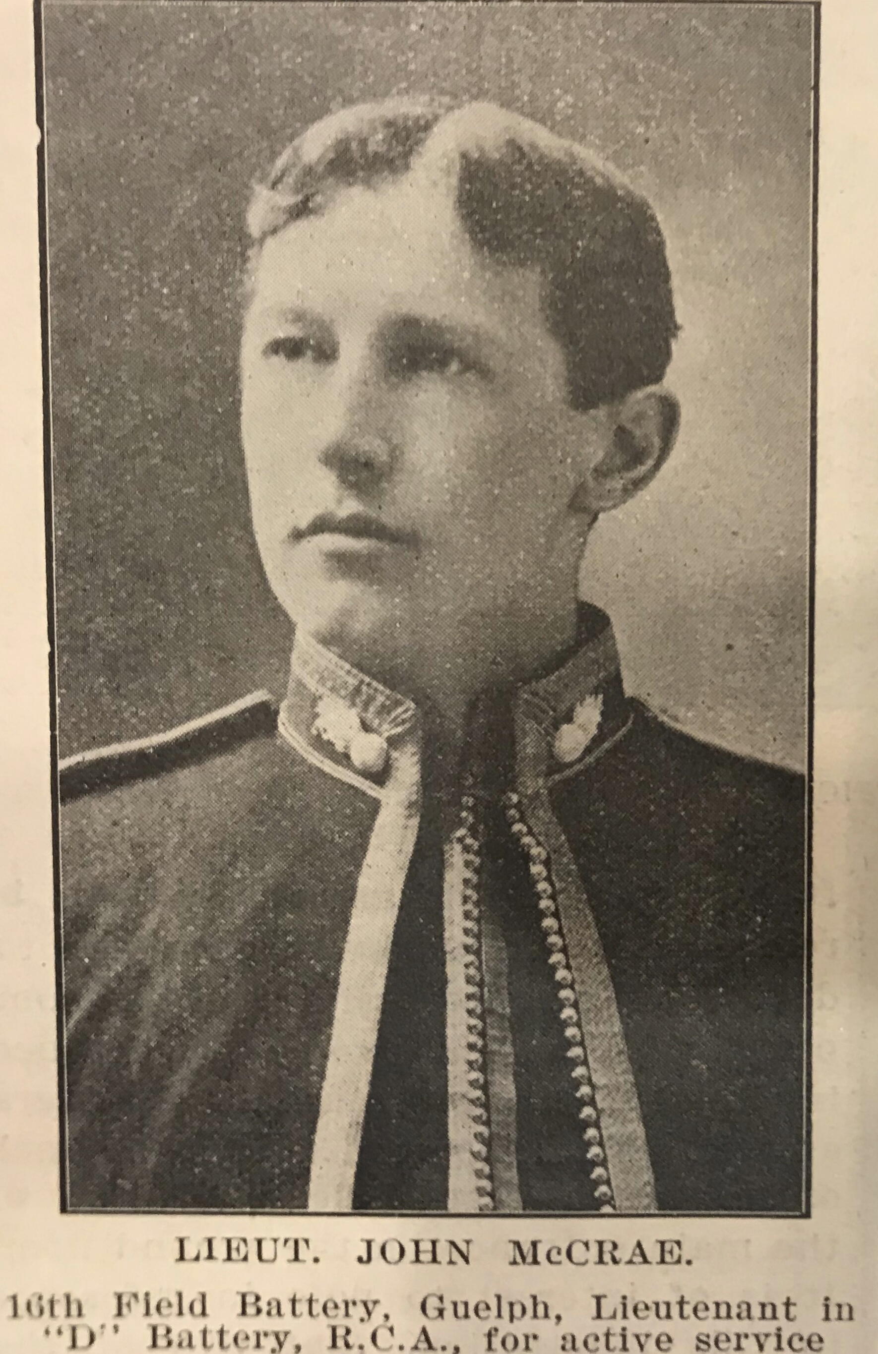 John McCrae a commencé à écrire des poèmes pendant qu'il était étudiant au Guelph Collegiate Institute. Dès l'adolescence, il s'est aussi intéressé à la vie militaire. À 14 ans, il se joignait au Highland Cadet Corps et à 17 ans, il s'enrôlait dans la batterie de campagne de la milice commandée par son père.