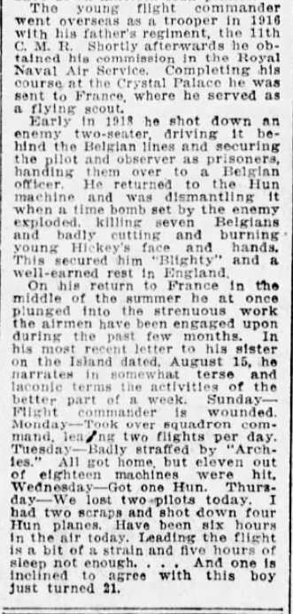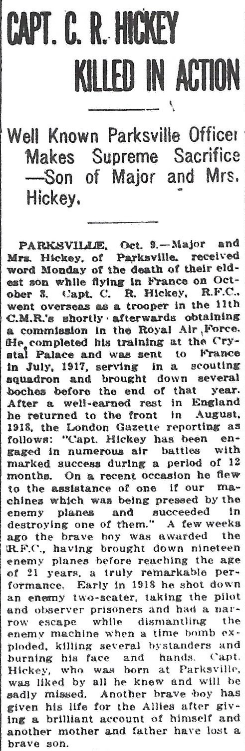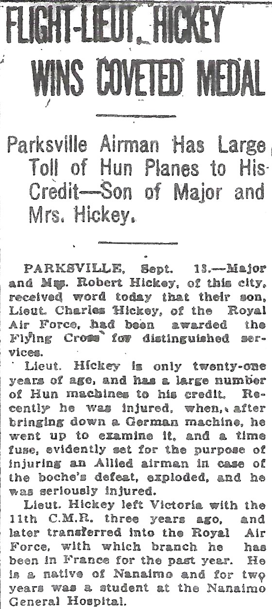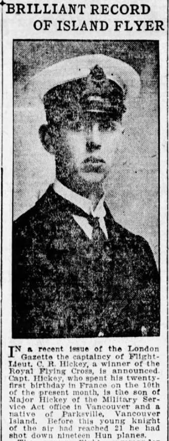 Fils du majeur Robert Hume Fayrer Hickey (11e Bataillon canadien de fusiliers à cheval) et de Charlotte Emily (née Reeves) Hickey, de Parksville, en Colombie-Britannique. Agriculteur de profession, il était célibataire. Durant une période de 12 mois, il a pris part, avec succès, à de nombreuses batailles aériennes. Il est allé récemment à la rescousse d'un de nos aéronefs qui était attaqué par deux aéronefs ennemis, et il est parvenu à abattre l'un d'entre eux. - Citation (DFC), London Gazette, le 3 août 1918.