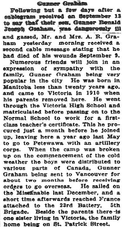 Fils de Adne Richmond Graham, de 1405, St. Patrick St., Victoria, Colombie-Britannique, Canada; époux de Meta Neville Graham.