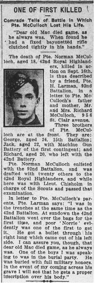 Fils de Richard et Sara McCulloch, de 956, St. Clair Avenue West, Toronto. Originaire de Glasgow, Écosse.