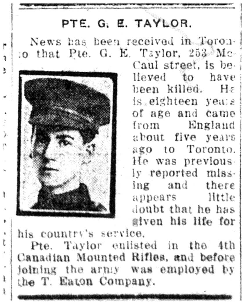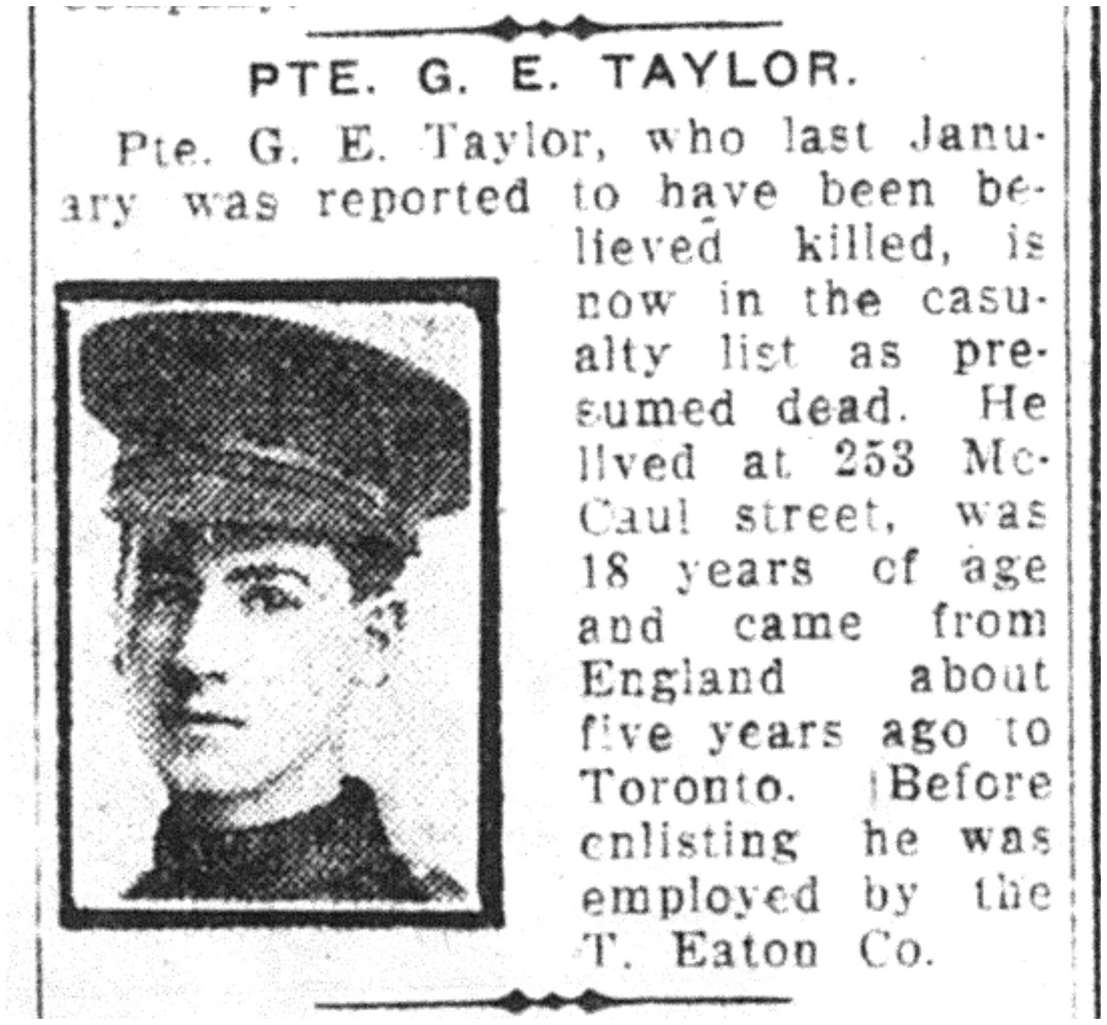 Fils de Arthur Edward et Phoebe Taylor, de 38, Royce Avenue, Toronto. Né à Woking, Angleterre.