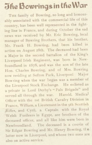 Fils de Charles et Laura A. Bowring, de Chislehurst, Sifton Park, Liverpool, Angleterre. Frère d'Eric et cousin de Sir Edgar A. Bowring.