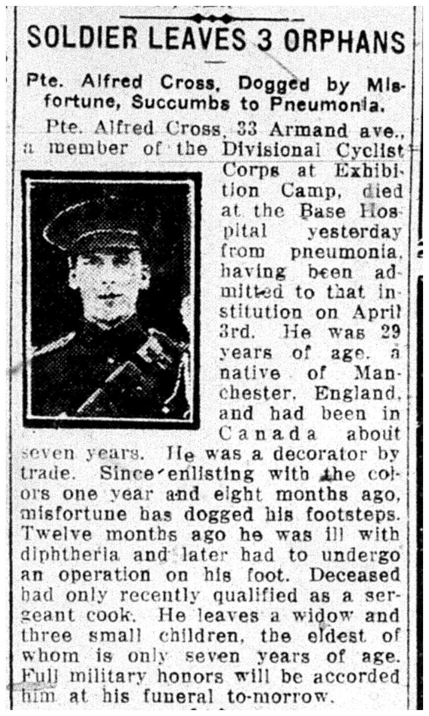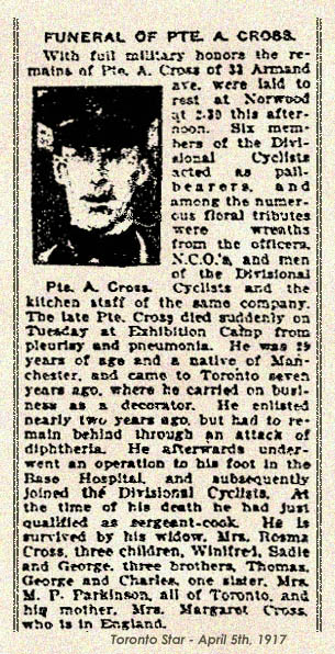 Fils de Margaret Cross, de 6, Streford St., Hulme, Manchester, Angleterre, et feu Charles Cross; époux de Rosina Cross, de 61, Pickering St. East, Toronto, Ont.