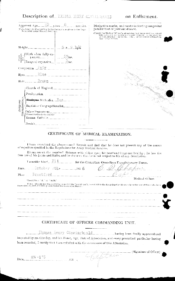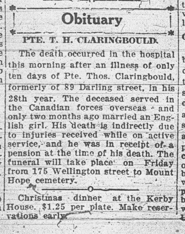 Fils de Thomas Richard et Emily Claringbould, de Idover, Kent, Angleterre; époux de Emma Claringbould, de Brantford, Ontario.