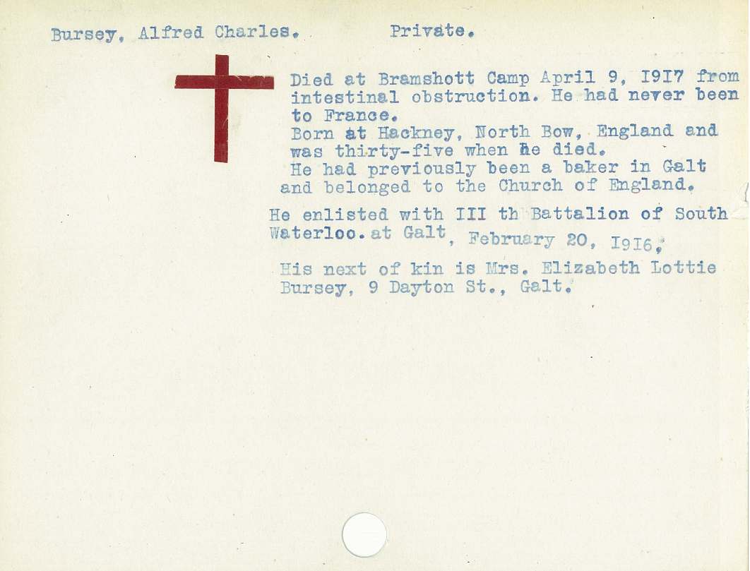Fils de Eli et L. M. Bursey, de 7, White Post Lane, Hackney Wick, London, Angleterre; époux de Lottie Bursey, de 43, Chalmer St., Galt, Ontario.