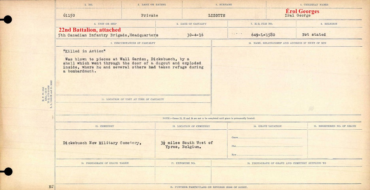Il était attaché au quartier-général de la brigade en tant que commis et il a été tué instantanément par un obus qui a traversé la porte et explosé dans l’abri où il s’était abrité avec plusieurs autres durant un bombardement.