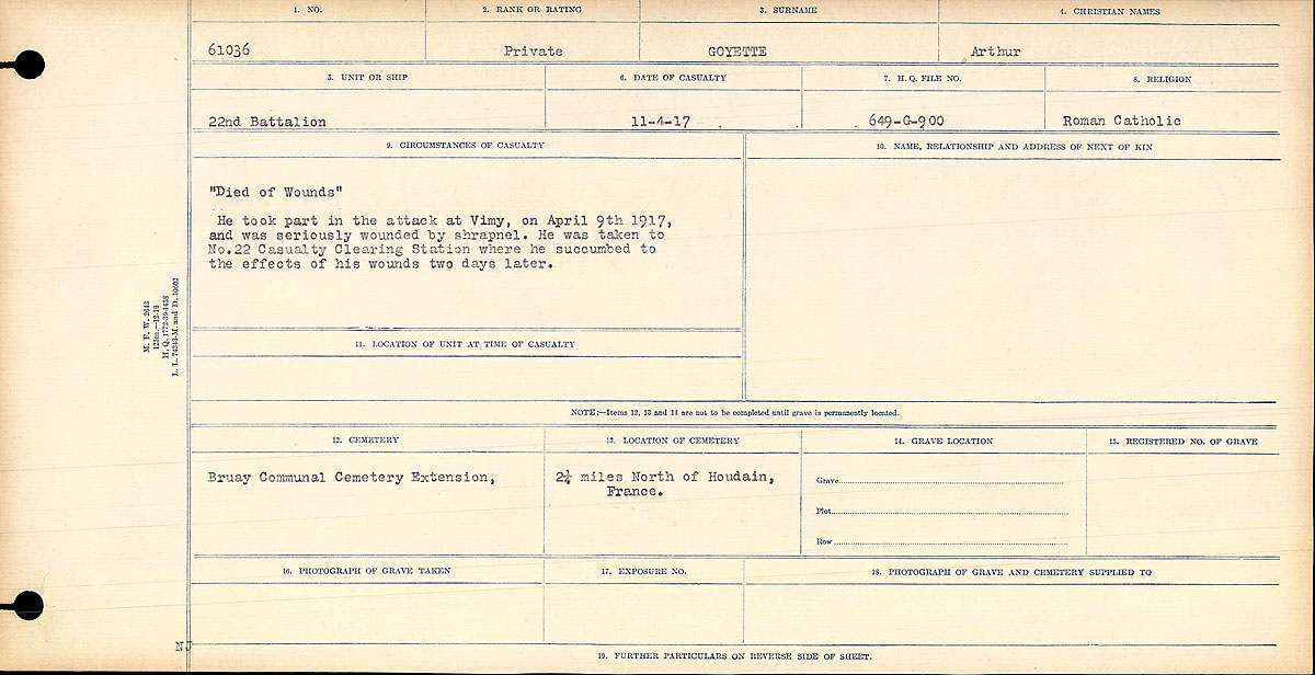 Durant l’assaut contre la Crête de Vimy le 9 avril il a été blessé grièvement d’un éclat d’obus à l’abdomen et évacué au Poste de triage des blessés n° 22 à Bruay. Il y est mort deux jours plus tard.
