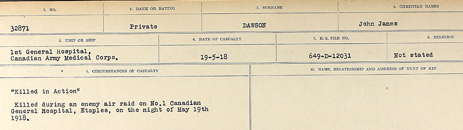 Fils de Albert Edward et Ellen Dawson, de Montréal. On Jan. 2nd, 1913, his birthday, at the risk de his own life, he saved two other boys from drowning in the St. Lawrence River, nr. Montréal.
