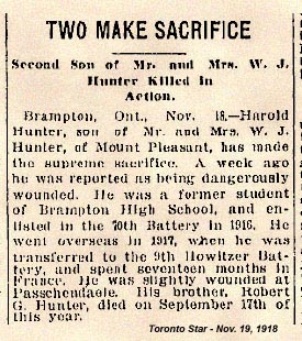 Frère du canonnier Robert Godfrey Hunter, décédé au service du Canadian Field Artillery.