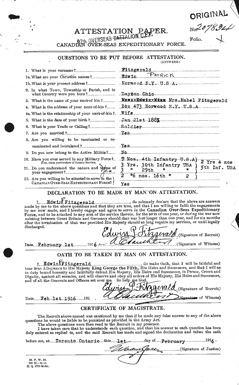 Enrôlement : 1 février 1916 Toronto, Ontario