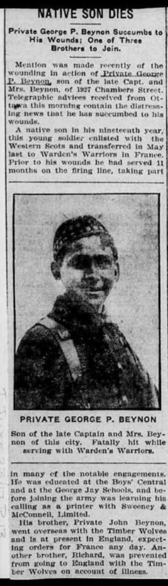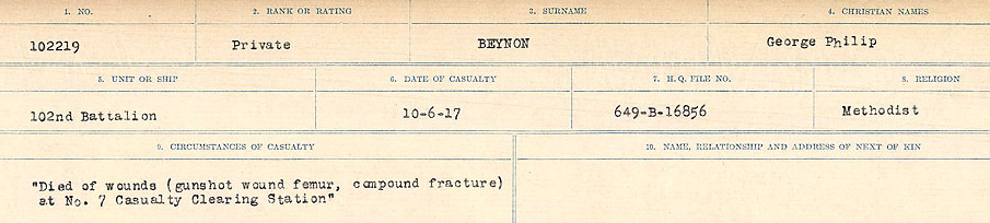 Fils de William et Rebecca Beynon, de Victoria, Colombie-Britannique. Frère de William, John, James, Victor, Fred et soldat Richard Arthur Beynon, 103 batalion, mort des maladies le 22 décembre 1918.