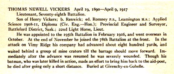 Fils de Henry et Jennie Vickers, de Renwick, Ontario. Provincial Enginéer et Surveyor, Battleford District, Saskatchewan.
