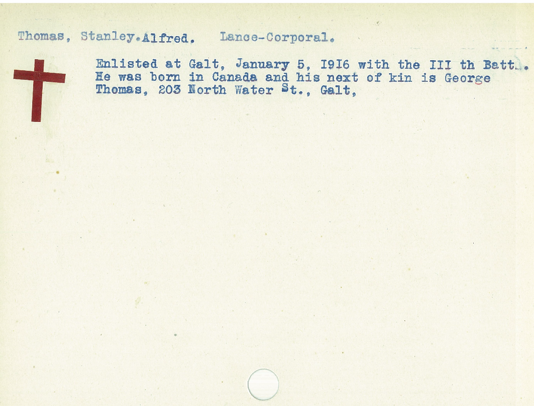 Fils de Henry et Rose Ann Thomas, de 67, Elliott St., Galt, Ontario. Originaire de Sittingbourne, Angleterre.
