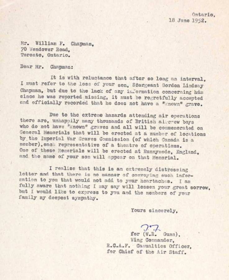 Au cours de la Seconde Guerre mondiale, plus de cent seize mille hommes et femmes des forces aériennes du Commonwealth britannique sont morts au champ d'honneur. Plus de dix-sept mille d'entre eux étaient membres de l'Aviation royale canadienne ou des Canadiens qui servaient dans la Royal Air Force. Presque un tiers des morts n'ont pas de sépulture connue. De ce total, vingt mille quatre cent cinquante sont commémorés par nom au Mémorial de Runnymede situé à Englefield Green, près d'Egham, à trente-deux kilomètres à l'ouest de Londres.