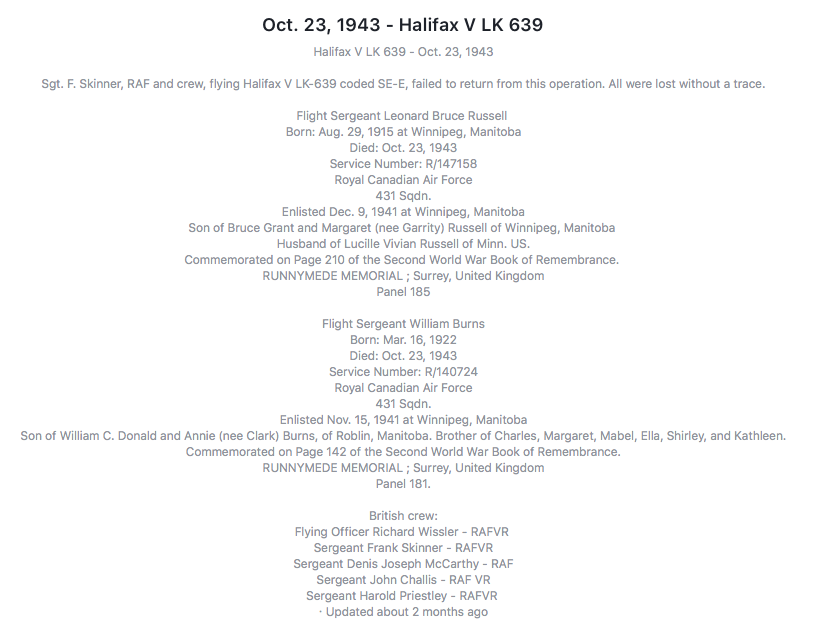 Au cours de la Seconde Guerre mondiale, plus de cent seize mille hommes et femmes des forces aériennes du Commonwealth britannique sont morts au champ d'honneur. Plus de dix-sept mille d'entre eux étaient membres de l'Aviation royale canadienne ou des Canadiens qui servaient dans la Royal Air Force. Presque un tiers des morts n'ont pas de sépulture connue. De ce total, vingt mille quatre cent cinquante sont commémorés par nom au Mémorial de Runnymede situé à Englefield Green, près d'Egham, à trente-deux kilomètres à l'ouest de Londres.