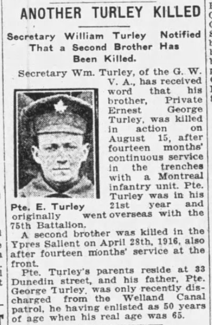 Frère de George Evelyn Turley, décédé le 28 avril 1916 pendant qu’il servait dans le Canadian Infantry (Quebec Regiment).