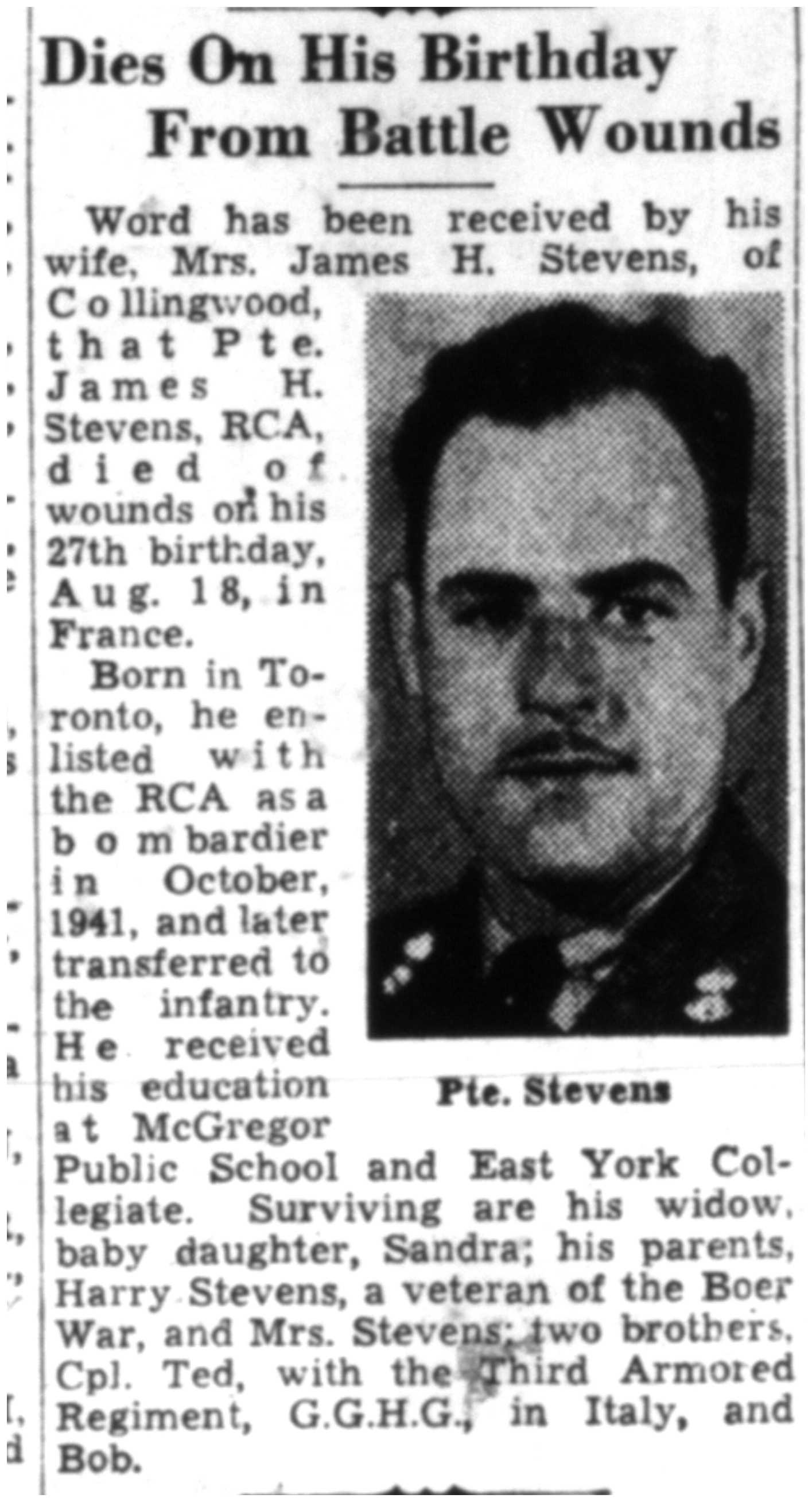 Les Canadiens qui sont morts vers la fin des combats en Normandie sont inhumés au cimetière militaire canadien de Bretteville-sur-Laize. Le cimetière militaire canadien de Bény-sur-Mer compte 2048 sépultures, ainsi qu'un monument spécial érigé à la mémoire d'un soldat du Corps canadien d'infanterie dont on sait qu'il a été inhumé ici, mais dont la tombe n'a jamais pu être trouvée.