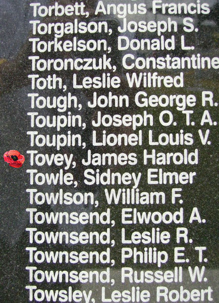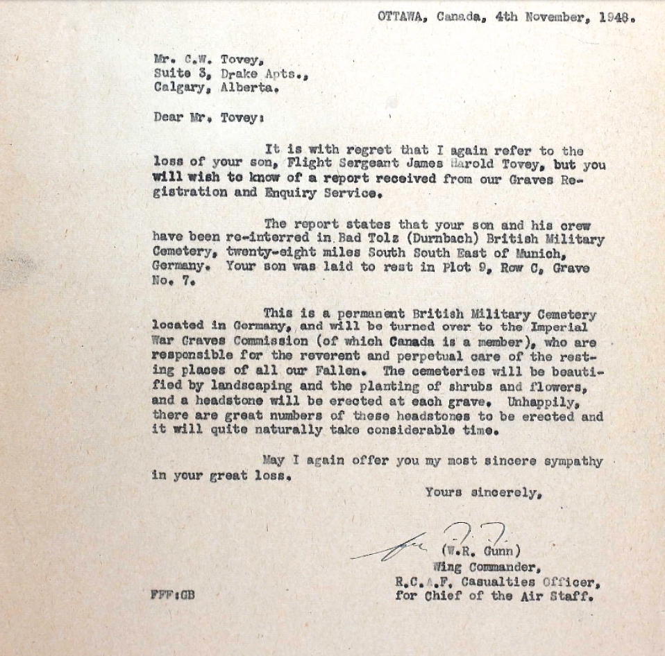 Fils de Charles Wilfrid et Margaret (née Faulkner) Tovey, de Calgary, Alberta. Frère de Kathleen et Joan.