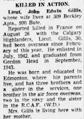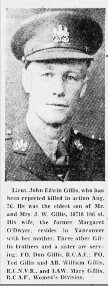 Fils de John W. et Dorothy R. Gillis d'Edmonton, Alberta. Époux de Margaret Maude Gillis de Vancouver, Colombie-Britannique.