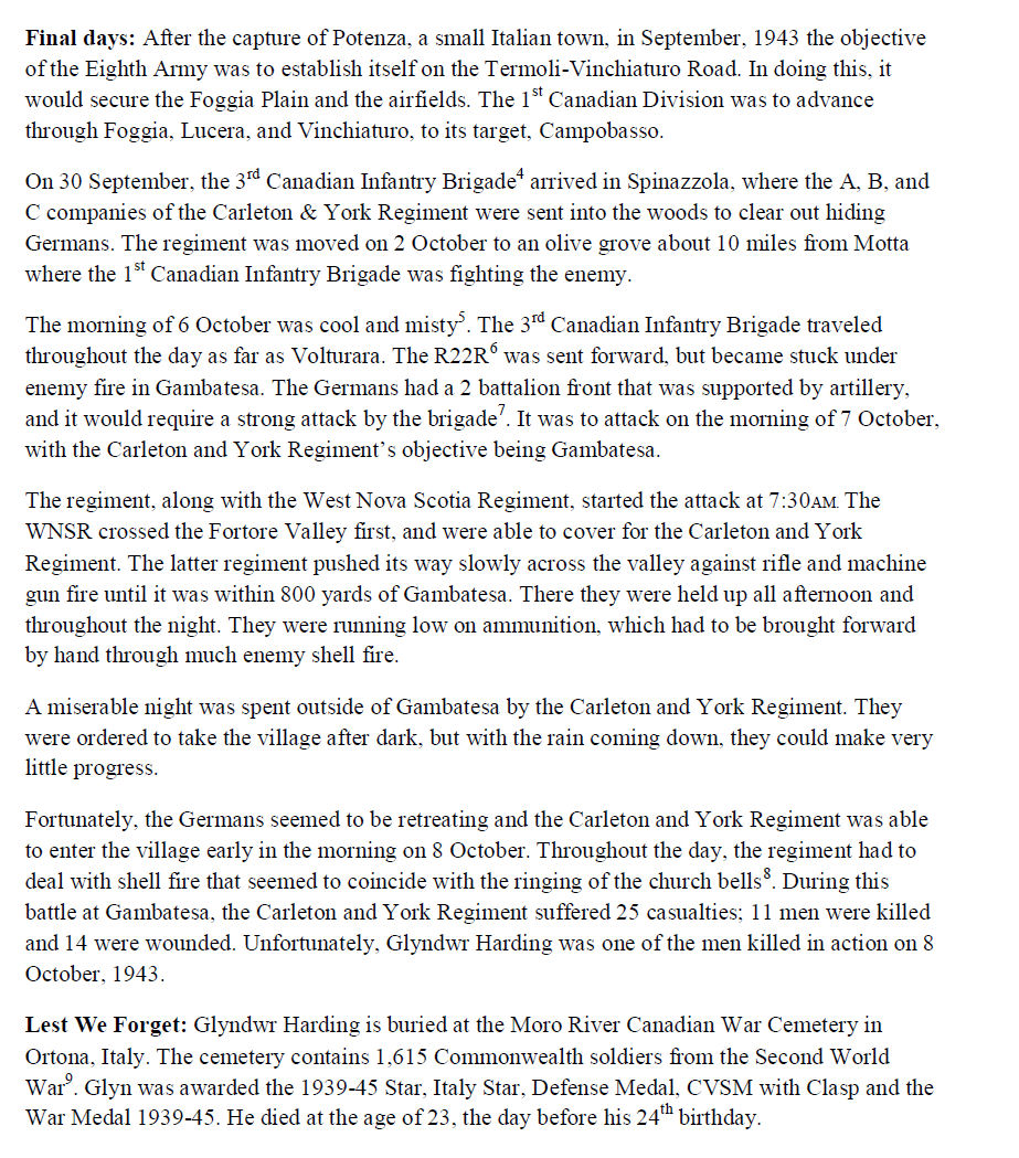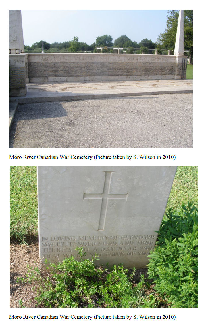 Pendant l'hiver de 1943, les armées allemandes en Italie défendaient une ligne qui s'étendait depuis la mer Thyrénéenne au nord de Naples, jusqu'à l'Adriatique au sud d'Ortona. L'objectif des Alliés consistait à enfoncer cette ligne et à s'emparer de Rome. De son côté, la 1re Division de l'infanterie canadienne devait franchir la rivière Moro et s'emparer d'Ortona. En janvier 1944, les Corps d'armée canadien choisit ce site, afin d'y inhumer ceux qui périrent au cours de la bataille d'Ortona et des combats livrés pendant les semaines qui l'avaient précédée et suivie. Aujourd'hui, on y trouve 1 651 sépultures dont plus de 50 non identifiées et celles de 1 375 Canadiens.