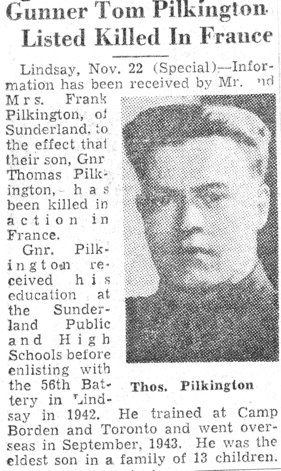 Fils de Frank et Elizebeth Pilkington, de Sunderland, Ontario.
