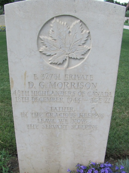 Pendant l'hiver de 1943, les armées allemandes en Italie défendaient une ligne qui s'étendait depuis la mer Thyrénéenne au nord de Naples, jusqu'à l'Adriatique au sud d'Ortona. L'objectif des Alliés consistait à enfoncer cette ligne et à s'emparer de Rome. De son côté, la 1re Division de l'infanterie canadienne devait franchir la rivière Moro et s'emparer d'Ortona. En janvier 1944, les Corps d'armée canadien choisit ce site, afin d'y inhumer ceux qui périrent au cours de la bataille d'Ortona et des combats livrés pendant les semaines qui l'avaient précédée et suivie. Aujourd'hui, on y trouve 1 651 sépultures dont plus de 50 non identifiées et celles de 1 375 Canadiens.