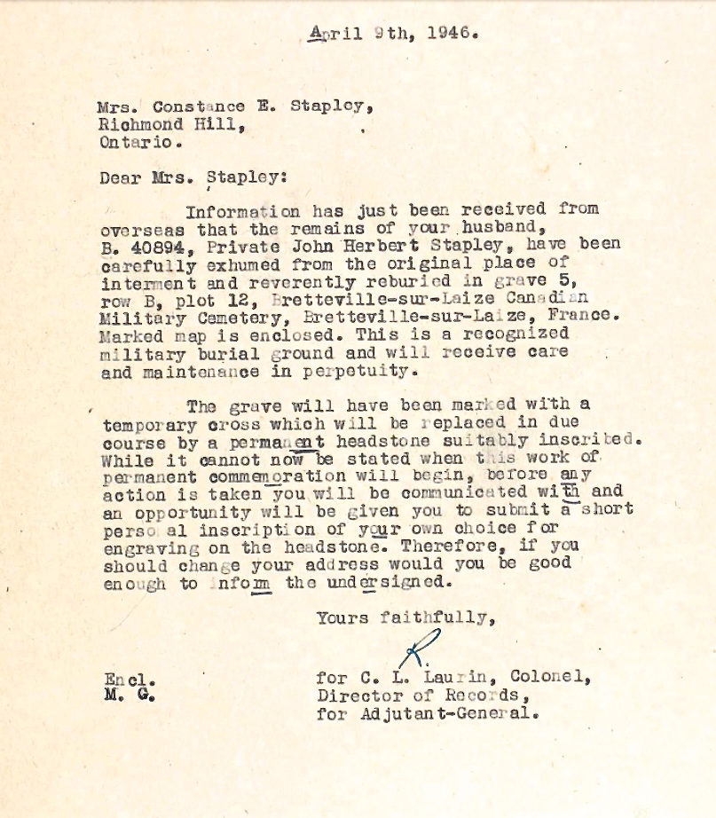 Fils de Frederick Alfred et Emily Wallis Stapley. Époux de Constance Edithe Stapley de Richmond Hill, Ontario.
