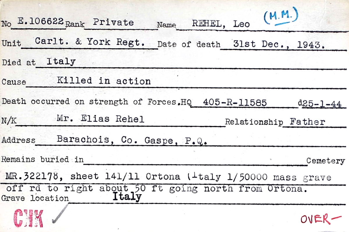 Pendant l'hiver de 1943, les armées allemandes en Italie défendaient une ligne qui s'étendait depuis la mer Thyrénéenne au nord de Naples, jusqu'à l'Adriatique au sud d'Ortona. L'objectif des Alliés consistait à enfoncer cette ligne et à s'emparer de Rome. De son côté, la 1re Division de l'infanterie canadienne devait franchir la rivière Moro et s'emparer d'Ortona. En janvier 1944, les Corps d'armée canadien choisit ce site, afin d'y inhumer ceux qui périrent au cours de la bataille d'Ortona et des combats livrés pendant les semaines qui l'avaient précédée et suivie. Aujourd'hui, on y trouve 1 651 sépultures dont plus de 50 non identifiées et celles de 1 375 Canadiens.