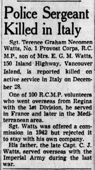 Fils de Capt. Charles et Eva Watts, de Vancouver, Colombie-Britannique.