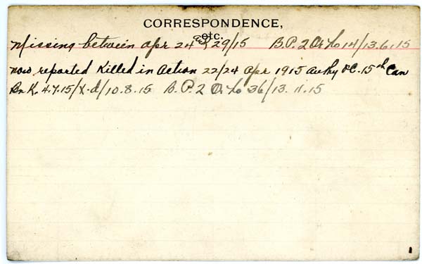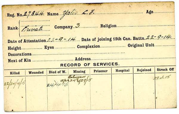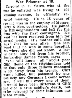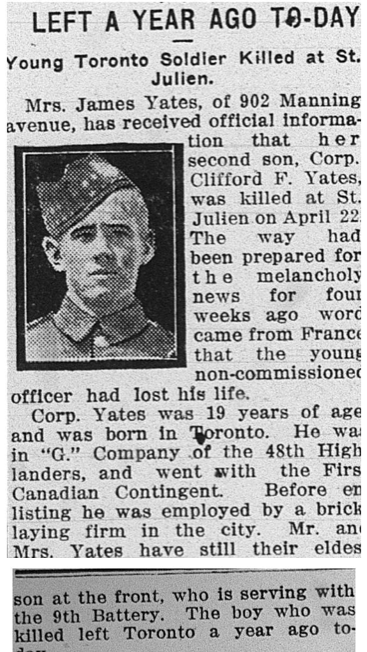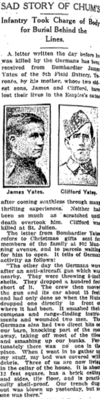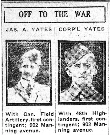 Frère du bombardier James Ashley Yates, décédé 5 décembre 1915 pendant qu’il servait dans l'Artillerie canadienne de campagne.