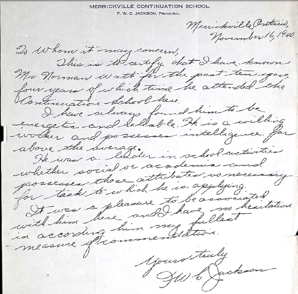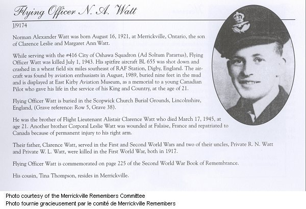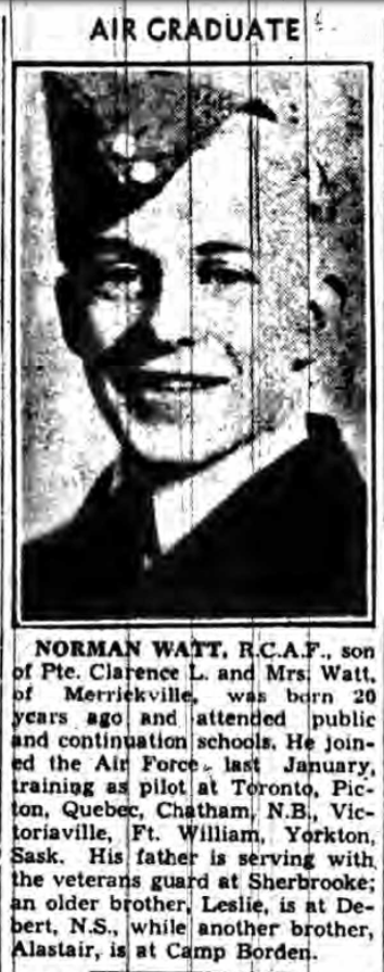 Fils de Clarence Leslie et Margaret Ann Watt, de Merrickville (Ontario). Frère du capitaine d'aviation Alistair Watt, qui a servi dans l'Aviation royale du Canada et qui est décédé le 17 mars 1945.