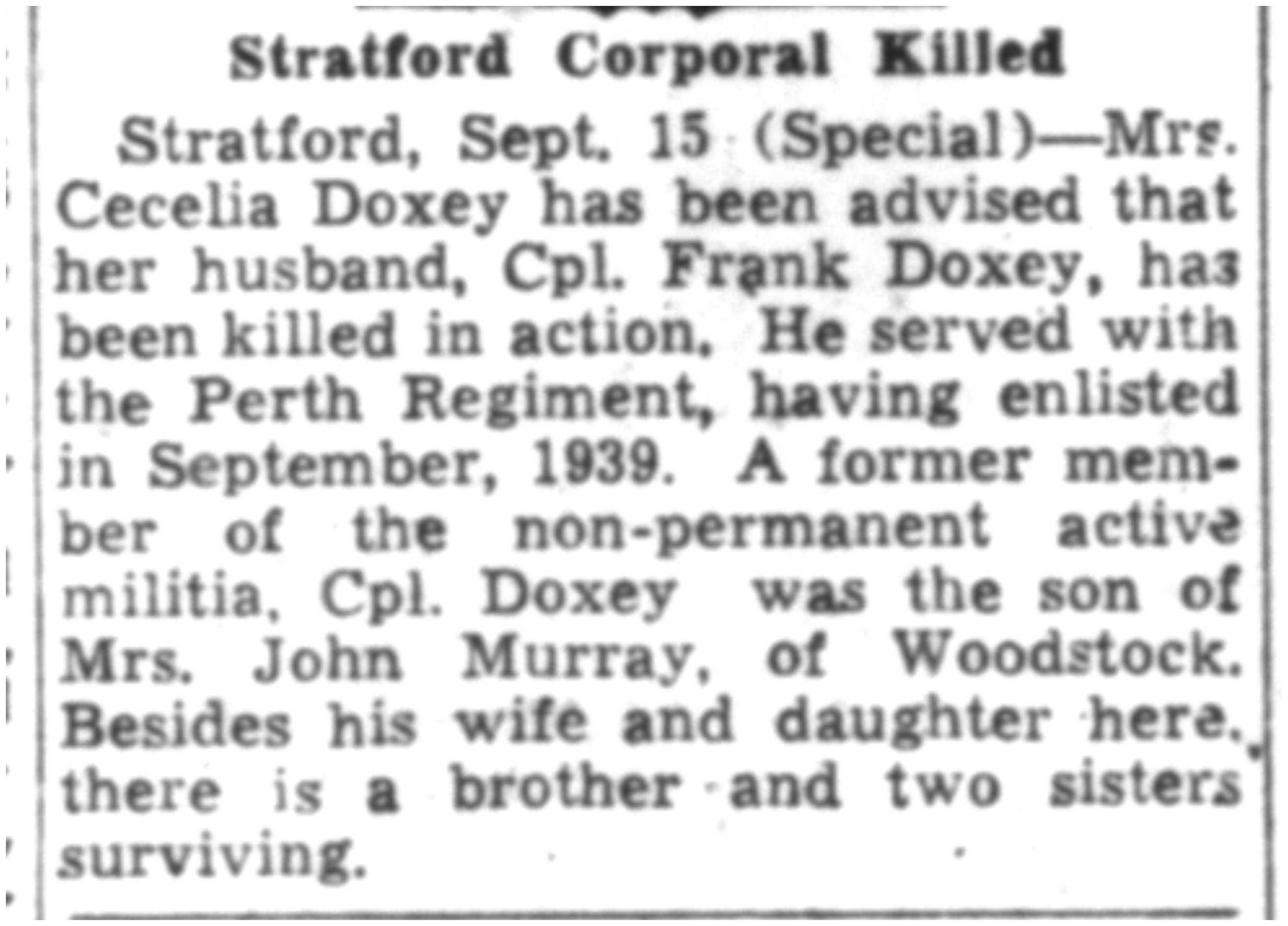 Fils de Frank et Margaret Doxey, de Stratford, Ontario. Époux de Cecelia Anne Doxey, de Stratford.