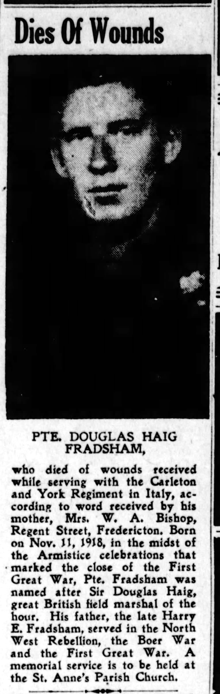 Fils de Henry E. et Mary Maud Fradsham, de Fredericton, Nouveau-Brunswick.