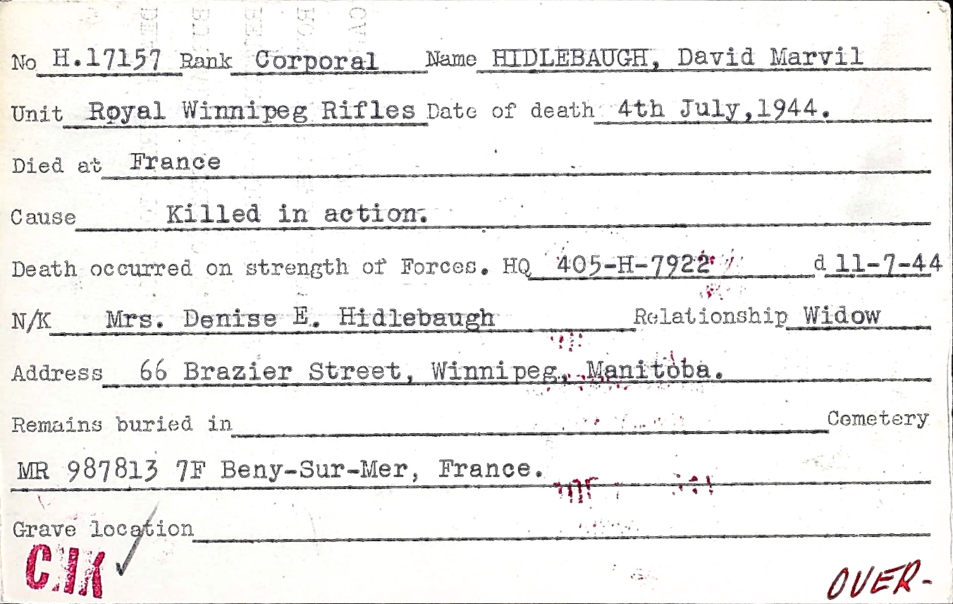 Les Canadiens qui sont morts vers la fin des combats en Normandie sont inhumés au cimetière militaire canadien de Bretteville-sur-Laize. Le cimetière militaire canadien de Bény-sur-Mer compte 2048 sépultures, ainsi qu'un monument spécial érigé à la mémoire d'un soldat du Corps canadien d'infanterie dont on sait qu'il a été inhumé ici, mais dont la tombe n'a jamais pu être trouvée.