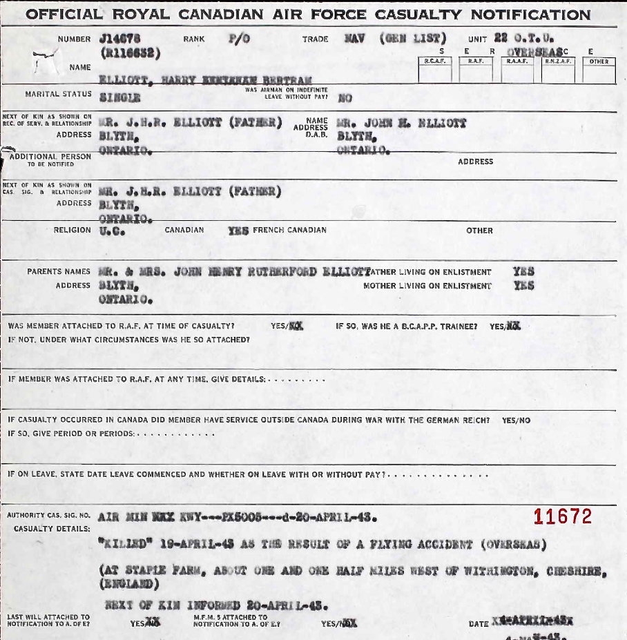 Fils de John H. R. Elliott et Ada M. Elliott, de Blyth, Ontario.