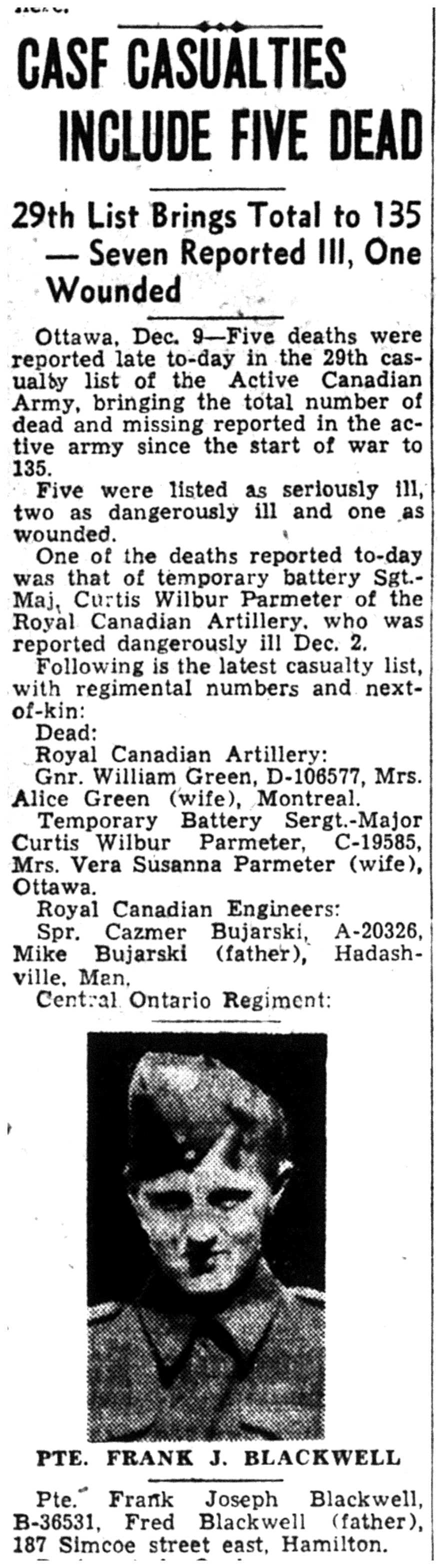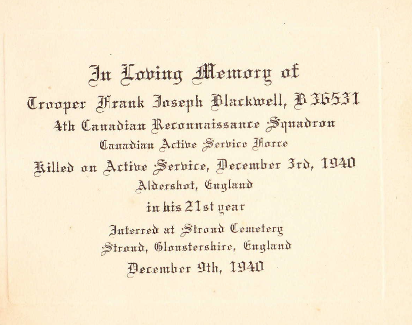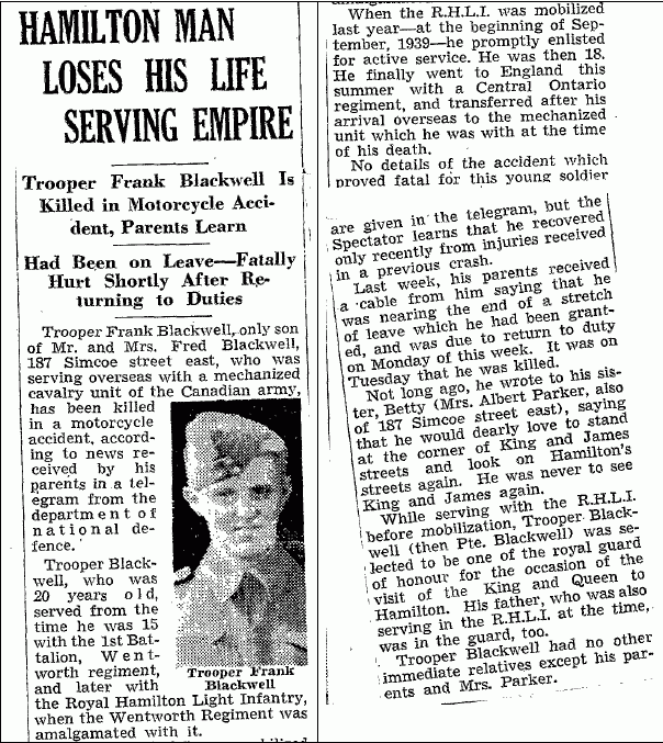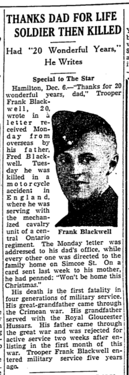 Fils de Frederick et Annie G. Blackwell, de Hamilton, Ontario, Canada.