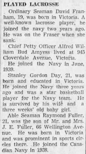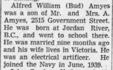 Fils de Alfred et Ellen Aymes, de Victoria, BC. Époux de Margaret M. Amyes, de Victoria.